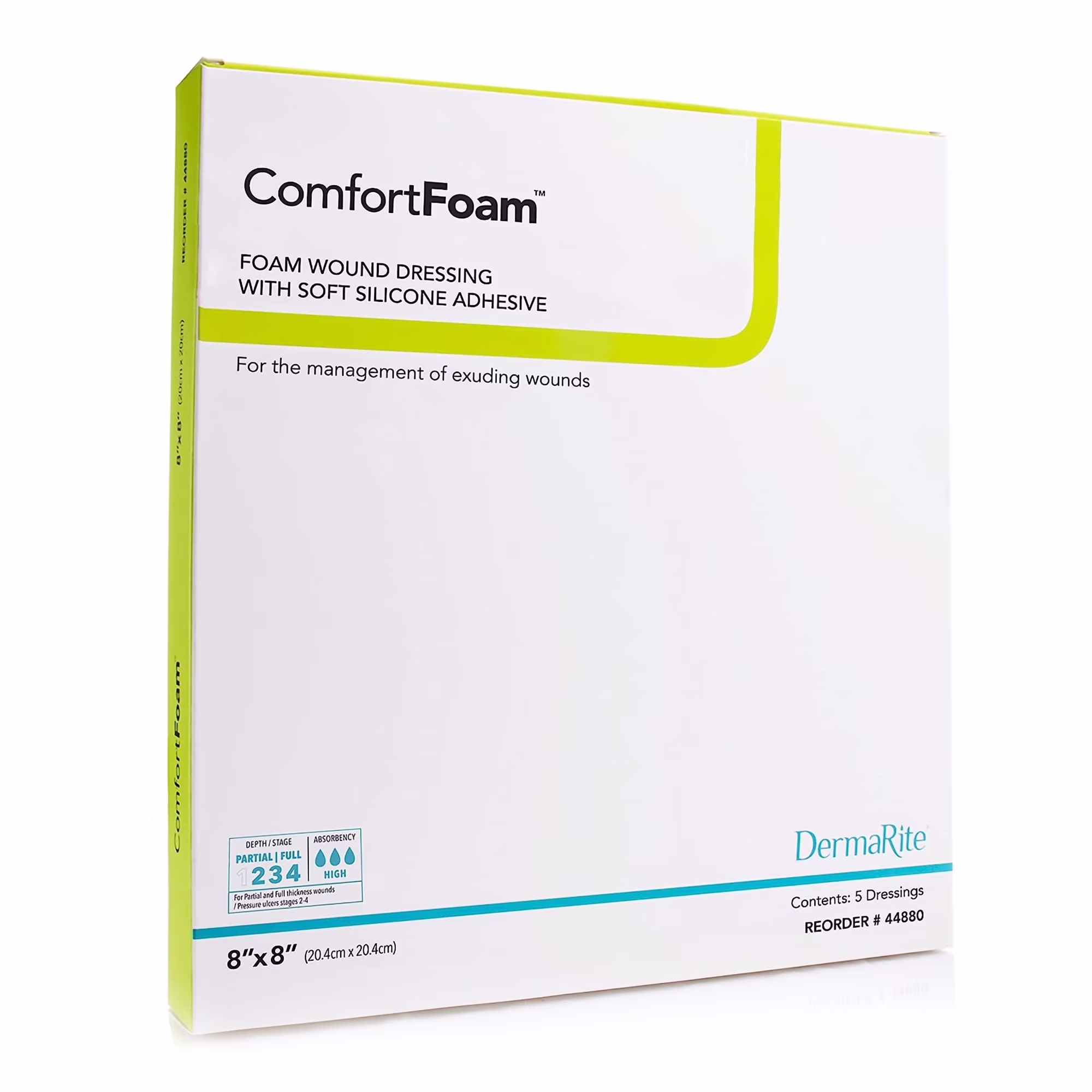 ComfortFoam dressing 8×8″, box of 5—non-adhesive, absorbent foam pad for wounds. Maintains moist healing for pressure ulcers or surgical sites in elderly patients.